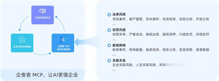 企查查MCP基于3.65亿家国内企业、超千亿条动态数据,深度融合工商、司法、知识产权、舆情等垂直领域数据,通过随接随用的模式,为企业AI系统注入“可信赖的数据基因”。